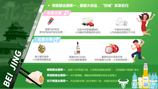 北京地区销售额位列全国第一,是名副其实的“1小时电商之城”。在啤酒和饺子的销量上也勇夺桂冠,饺子的销量甚至达到了位居第二的天津的1.7倍,足见北京居民对饺子的喜爱。北京的女性消费者似乎对保健品不太感冒,人均保健品消费仅位于中流水平。而北京男性消费者则是全国最不爱吃香菜的,人均香菜销量垫底。