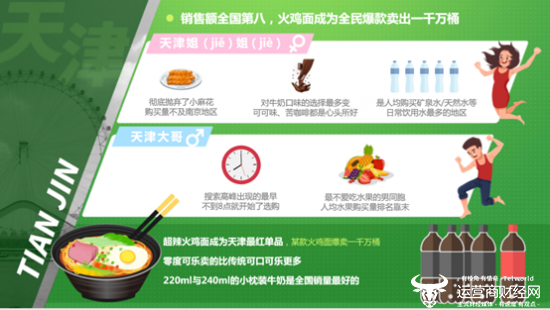 《报告》显示,天津2018年销售额位居全国第八名,超辣火鸡面成为了天津市民最爱的单品,某款火鸡面一年售出超过一千万桶。在天津,不到8点小伙们就开始了一天的生鲜选购,是搜索早高峰出现最早的城市。值得一提的是,在天津,零度/健怡等无糖型可乐的销量比传统可乐更高,天津市民在饮料的选择上愈发注重健康。