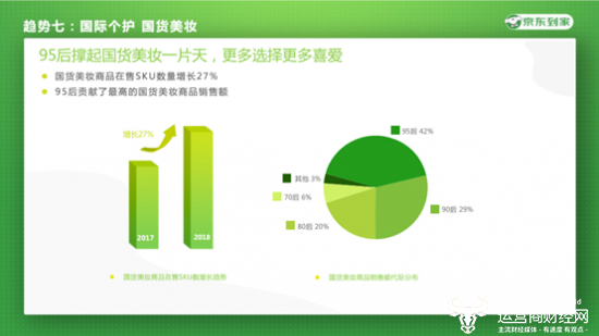 在美妆类商品中,“国货”成为了2018年的关键词,在各大社交平台上都出现了国货美妆爆品。在京东到家上,国货美妆品格外受到95后消费者的推崇,销售额占比达到42%。同时,国货美妆产品在售SKU数量也增长了27%,为消费者提供了更多选择。
