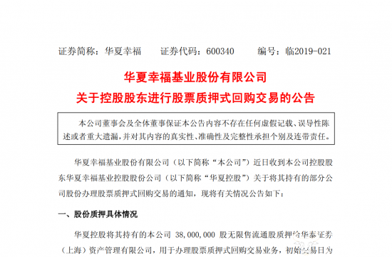 2019年1月30日,华夏幸福基业股份有限公司(以下简称“华夏幸福”)发布公告称,华夏幸福控股股东华夏幸福基业控股股份公司(以下简称“华夏控股”)将其持有的华夏幸福0.38亿股无限售流通股质押给华泰证券 (上海)资产管理有限公司,用于办理股票质押式回购交易业务,初始交易日为2019年1月30日,购回交易日为2020年1月21日。上述质押股份占华夏幸福总股本30.03亿股的1.27%。