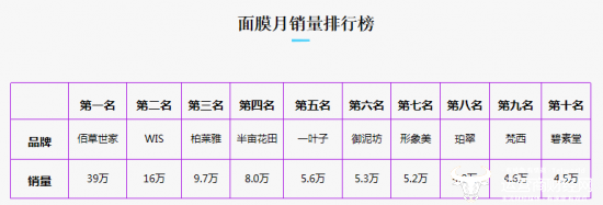 面膜月销量排行榜显示,风头很盛的一叶子、御泥坊排在第五名和第六名,销量仅仅处于榜上的中等水平,甚至没有突破10万。而佰草世家和WIS的销量均过10万,并分别排在第一和第二的位置。