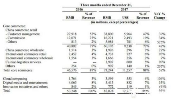 阿里营收增速创历史新低,除了与全球市场在经历缓慢和不确定的增长阶段以外,和其2018的改革与调整密不可分。阿里的四大业务板块分别为核心电商、云计算、数字媒体、娱乐以及创新项目。核心电商是阿里实现单季营收突破千亿推动者,但阿里在核心业务增速上却在不断放缓,营收环比却下滑了16.2个百分点,同比下滑16.6个百分点。可以看出阿里在核心业务货币化上已经遭遇瓶颈,亟待破局。