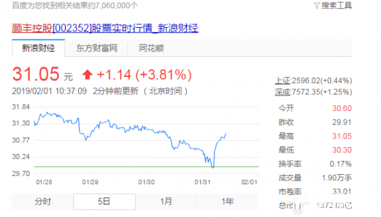 值得注意的是,2019年的2月1日,顺丰控股的股价报收31.05元/股,市值为1372.03亿元,与市值最高时的3226亿元市值减少了1853.97亿元。