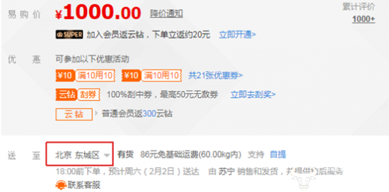 2、选择送至区域,仅限“北京”;
