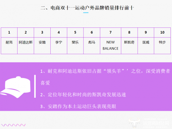此外,定位年轻化和时尚的斯凯奇也在近两年发展迅速,数据显示,斯凯奇在2018年618电商节庆中,官方店铺销售额同比增长77%。去年的双十一大战,斯凯奇再次跻身销量前十的榜单,足以可见其品牌影响力的扩大。