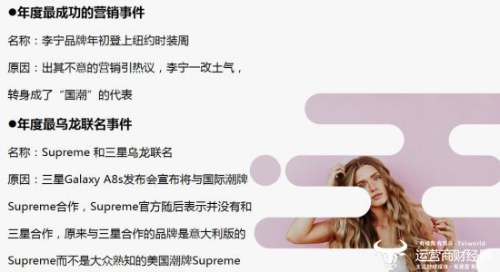 最后,年度最成功营销事件当属李宁,2018年年初李宁品牌年初登上纽约时装周,这波出其不意的营销引发热议,李宁一改土气转身成为“国潮”的代表。