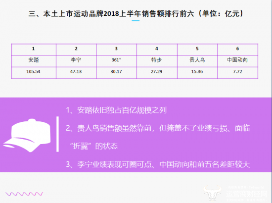 近日,运营商财经网发布了《2018年度中国消费品行业报告》,列出了国内上市运动品牌2018上半年销售排行榜单。从中可以看出,这些上榜的知名品牌表现各异。