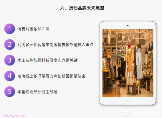 而从渠道运营来看,运动品牌铺陈电商渠道依旧是着力点,线上线下融合成趋势,零售终端部分成主战场。