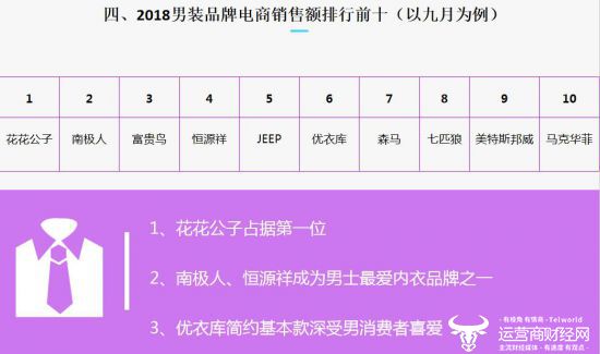 报告指出,2018年9月,男装品牌在电商渠道销售额排名前十的分别为花花公子、南极人、富贵鸟、恒源祥、JEEP、优衣库、森马、七匹狼、美特斯邦威以及马克·华菲。