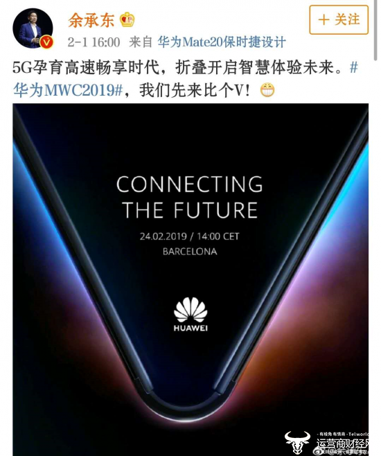 余承东在微博中转发邀请函并称: “5G孕育高速畅享时代,折叠开启智慧体验未来。#华为MWC2019#,我们先来比个V!”