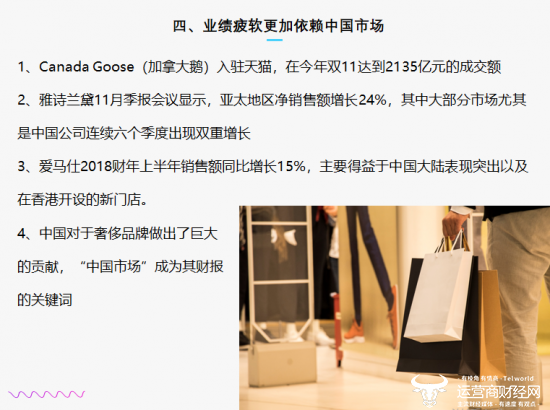值得一提的是,奢侈品行业业绩疲软,更加依赖中国市场。 Canada Goose(加拿大鹅)入驻天猫,在2018年双11达到2135亿元的成交额;雅诗兰黛2018年11月季报会议显示,亚太地区净销售额增长24%,其中大部分市场尤其是中国公司连续六个季度出现双重增长。