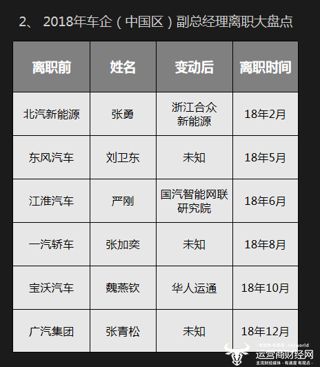 近日,国内知名媒体运营商财经网发布了“2018汽车领域数据分析报告”。报告显示,2018年有6位车企(中国区)副总经理离职,其中北汽新能源副总经理张勇离职加盟了汽车“新势力”。