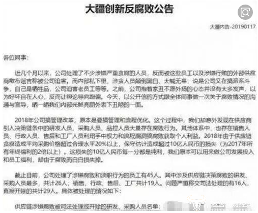 1月30日,大疆发布公开信表示,公司治理职务腐败的工作一而再、再而三被挑战:“一些被辞退的涉事员工自我辩白,在公司内外添油加醋地散播谣言,将负责反腐内审工作的同事描述为派系社团,掩饰甚至美化自己的工作过失与不当行为。”甚至还用了“触目惊心”“冰山一角”等词语形容此次事件,言辞十分激烈。