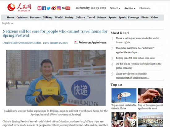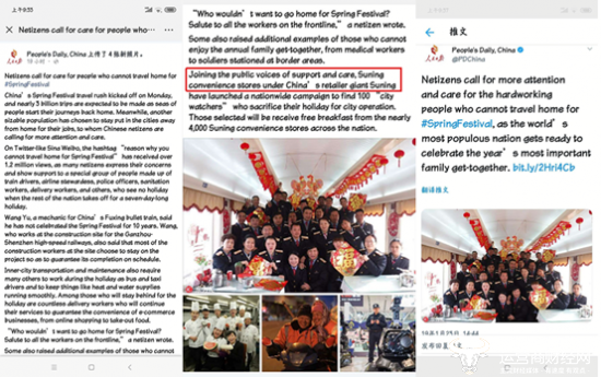 其实,苏宁小店“三公里灯塔”公益行动已经不是第一次被中央媒体关注。早在1月23日,人民日报海外版新媒体(People's Daily Overseas New Media)在人民网英文版发表了题为《网民呼吁关心春节不能回家的人》的文章。文章中介绍了“中国零售商巨头苏宁旗下的苏宁便利店在全国范围内开展寻找100名城市守护者的公益行动”。而人民日报Facebook账号、Twitter账号则转发了上述新闻报道,共同关注因坚守岗位而过年不能回家的普通劳动者。