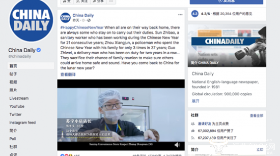 继人民日报海外版新媒体、人民日报Twitter、Facebook社交媒体账号的关注之后,2月4日(大年三十),苏宁小店“三公里灯塔”公益活动再次被中央级媒体中国日报(CHINA DAILY)的社交媒体Facebook账号推向全世界。由苏宁小店发起的寻找过年不回家坚守岗位的“城市守护者”,再一次展现在全世界面前。