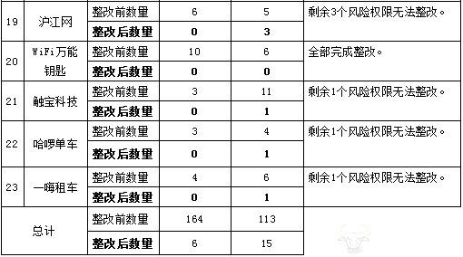 由于当前正处于被约谈APP计划完成整改的时间节点,所以上海市网信办进行了“回头看”复测,结果显示,整改后剩余6个“不合理权限”,15个“合理但存在风险权限”。