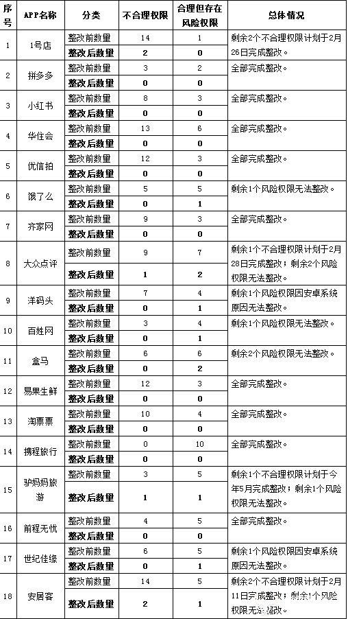按照上海市网信办的说法,“不合理权限”未整改是因企业战略调整等原因,“合理但存在风险权限”则是因为安卓系统的限制,无法完成“修改为一次性授权”的整改,未全部完成整改的APP也表示会对此类权限加强网络安全管控,防止个人信息泄露。