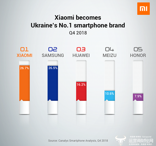 国际调研机构Canalys发布了一组最新数据,小米在乌克兰市场2018年Q4季度首次夺得排名第一,小米国际化业务再次交出了一份亮眼的成绩。