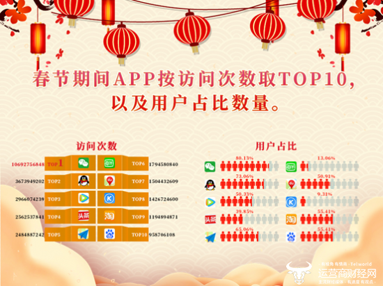 大家使用手机都干了啥?湖北移动对春节期间APP的访问次数进行了统计,数据显示最受欢迎的10大APP分别为微信、QQ、腾讯视频、今日头条、高德导航、爱奇艺、百度地图、酷狗音乐、淘宝、百度搜索。其中,80.13%的移动用户在假期间使用过微信,73.06%用户使用过QQ。