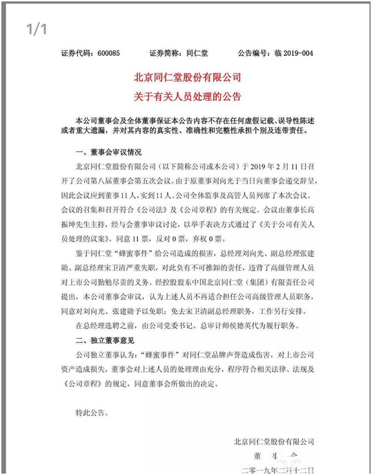 同仁堂集团对“蜂蜜事件”相关责任人员作出严肃处理