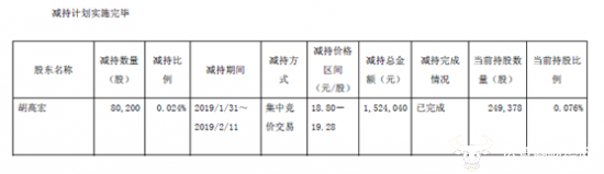 据悉,截至本公告披露日,胡高宏已通过集中竞价交易减持公司股份80200股,其本次减持计划实施完毕。胡高宏仍持有公司股份249378股,占减持计划披露时公司总股本 3.26亿股的0.076%,其中无限售条件流通股份 114068股,有限售条件流通股份135310股。
