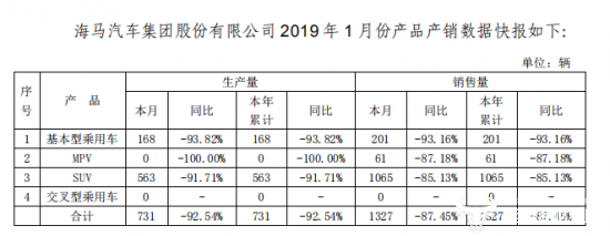 2月12日,海马汽车集团股份有限公司 (以下简称“海马汽车”)发布关于2019年1月份产销数据的自愿性信息披露公告。 公告显示,海马汽车2019年1月累计产量731辆,同比下降92.54%,累计销量1327辆,同比下降87.45%。