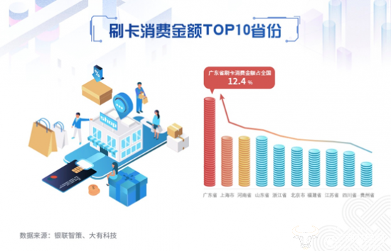 全国刷卡消费金额排名前十的省份依次为:广东、上海、河南、山东、浙江、北京、福建、江苏、四川、贵州。