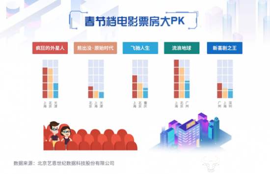 艺恩数据显示,截止2019年2月7日,《流浪地球》成为今年春节档的绝对黑马,多数影院都及时增加了排片;此外,北京地区受众对于适合少儿观看的《熊出没》最为买账。