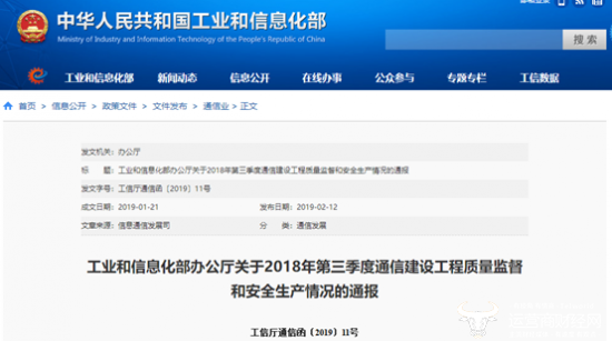 2019年2月12日,工业和信息化部办公厅发布关于2018年第三季度通信建设工程质量监督和安全生产情况的通报。