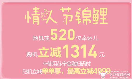 为了给有情人们送上爱的助攻,同时也可以在情人节关爱单身狗,苏宁手机在全国门店寻找“情人节锦鲤”,2月12——2月14日情人节期间,随机抽取520位幸运儿,在苏宁门店购买手机立减1314元,寓意“一生一世”,可以说是非常贴心了。