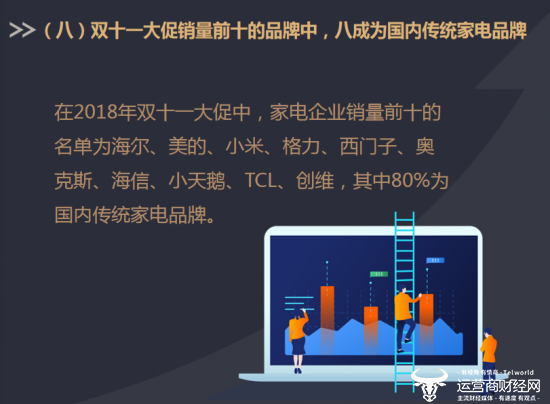 报告显示,在2018年双十一大促中,家电企业销量前十的名单为海尔、美的、小米、格力、西门子、奥克斯、海信、小天鹅、TCL、创维,其中80%为国内传统家电品牌。