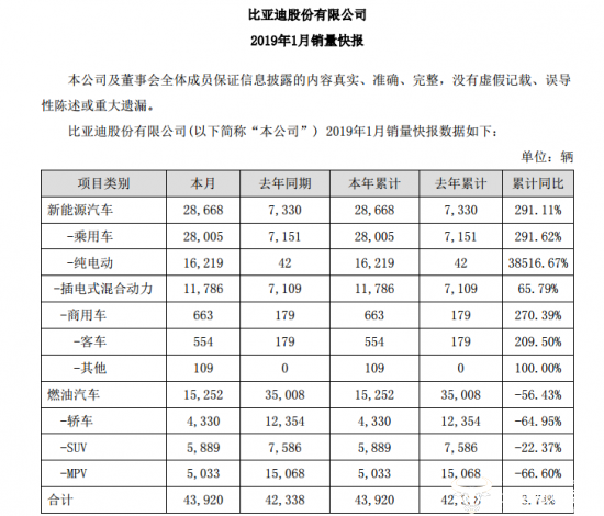 2月13日,比亚迪股份有限公司披露了2019年1月销量快报。快报显示,比亚迪1月汽车总销量为43920辆,比去年的42338辆同比增加3.74%。