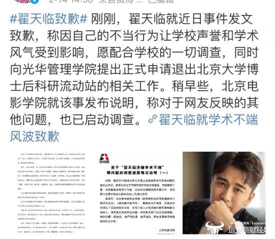 深陷学历造假旋涡的翟天临今天出来道歉了,他表示,是虚荣心和侥幸心让其迷失了自己,愿意积极配合北京电影学院的一切调查,并正式申请退出北大博士后科研流动站的相关工作。曾经凭借"学霸"人设疯狂吸粉,如今却"人设坍塌",翟天临这回能不凉吗?