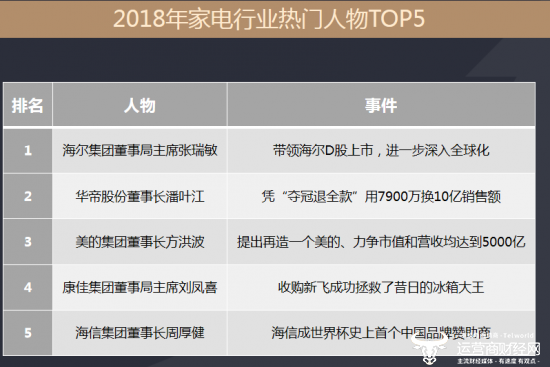 近日,运营商财经网发布了《2018年度家电行业研究报告》(简称“报告”),分析了2018年一年来家电行业的运行情况。在报告中运营商财经网统计了去年家电行业热门人物TOP5,张瑞敏、潘叶江、方洪波等业内人士皆榜上有名。
