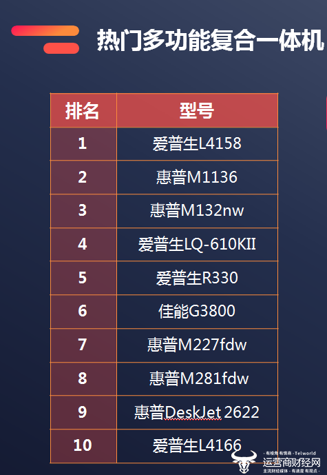 此外,在热门型号排行傍,多功能复合一体机排名前10的品牌型号中,爱普生L4158 排名第1,惠普M1136 、惠普M132nw 排名第2、第3,爱普生LQ-610KII 、爱普生R330、佳能G3800、惠普M227fdw、惠普M281fdw 、惠普DeskJet 2622 、爱普生L4166分别排在第4、第5、第6、第7、第8、第9、第10。