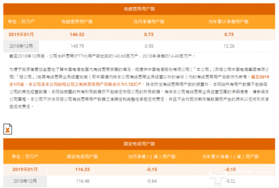 值得关注的是,公告显示,截至2018年12月底,中国电信光纤宽带(FTTH)用户数达到约1.41亿户,2018年净增约1449万户。与此同时,截至2019年1月底,中国电信及其母公司的有线宽带用户总数合计为1.72亿户。