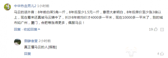 但网上还有另外一个声音,有网友@中华热血男儿2 解释,其实马云的预言还有画外音,8年前白菜5角一斤,8年后至少1.5元一斤,意思大家明白,8年后房价至少涨3倍以上,现在看来还真被马云猜中了,长沙8年前均价才4000多一平米,现在10000多一平米了,别的城市如广州,厦门,合肥等涨得更多,佩服马云!