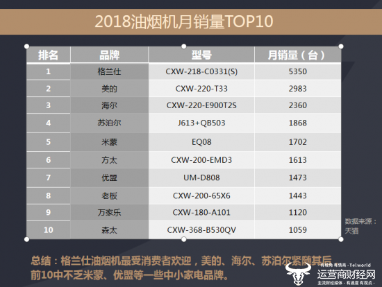 近日,运营商财经网发布了《2018年度家电行业研究报告》(简称“报告”),分析了2018年一年来家电行业的运行情况。在报告中运营商财经网根据去年家电行业的发展情况,统计出了天猫油烟机品牌月销量TOP10的名单,值得注意的是,美的虽然在家电市场备受欢迎,但油烟机月销量却不及格兰仕。