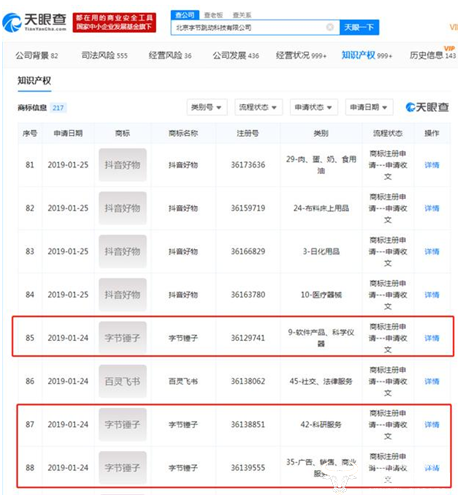 据资料数据显示,1月24日,北京字节跳动科技有限公司新增6个名为“字节锤子”的商标,所属类别分别为“软件产品、科学仪器”、“科研服务”、“广告、销售、商业服务”、“教育、娱乐服务”、“社交、法律服务”、“电讯、通信服务”,目前状态为申请收文。