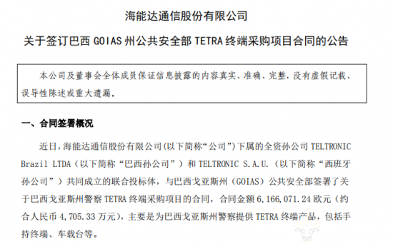 2月22日,海能达通信股份有限公司(简称“海能达”)发布一则关于签订巴西 TETRA 终端采购项目合同的公告,具体是什么情况呢?