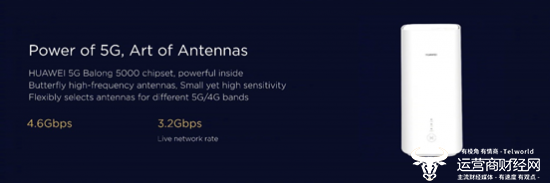此次发布的华为5G CPE Pro采用业内首款基于3GPP R15标准的多模芯片——华为巴龙 5000,该芯片支持Sub6G全频段覆盖。5G网络下,理论峰值速率可达4.6Gbps,现网实测速率高达3.2Gbps。