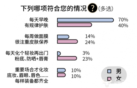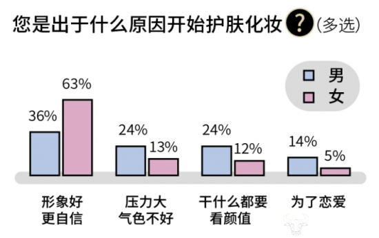 在这些精致男人中,36%的用户表示护肤和化妆品给了他们更多自信;剩下有24%的用户觉得高压工作气色不好,需要化妆品来掩盖;还有24%的男性表示,颜值不太够,全靠化妆凑;然而有14%的用户明确表示,男也要为悦己者容,化妆护肤就是为了找对象。
