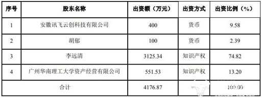 据了解,合资公司注册资本为 4176.87 万元人民币,其中,讯飞云创以货币 400 万元出资,出资比例为 9.58%;胡郁先生以货币 100 万元出资,出资比例为 2.39%;李远清先生以知识产权作价 3125.34 万元出资,出资比例为 74.82%;广州华南理工大学资产经营有限公司以知识产权作价 551.53 万元出资,出资比例为 13.20%。