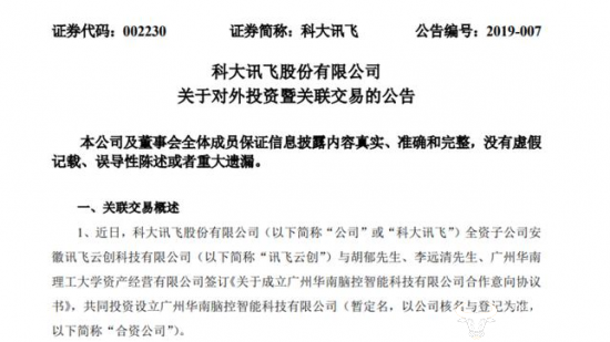 运营商财经网讯,科大讯飞近日发布公告称,其全资子公司安徽讯飞云创科技有限公司与胡郁、李远清、广州华南理工大学资产经营有限公司签订合作意向协议书,共同投资设立广州华南脑控智能科技有限公司。