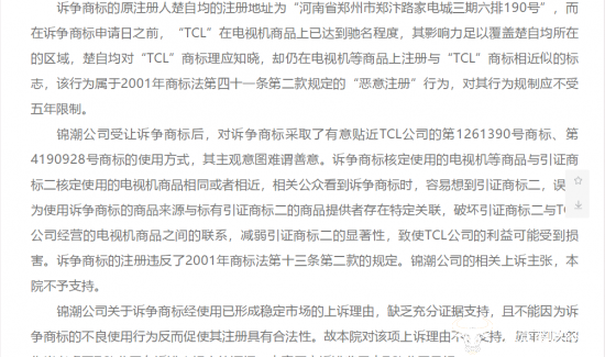 近日,北京市高级人民法院根据以“TCL”商标使用在电视机商品上已为公众广为知晓,达到驰名的程度;而诉争商标的原注册人楚自均对“TCL”理应知晓,却在电视机等商品注册与“TCL”相近的标志,属于“恶意注册”行为等在案证据可证事实而驳回锦潮公司上诉,维持一审判决。