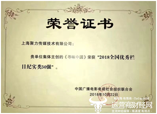 (图:《寻味中国》栏目获得“2018全国优秀栏目纪实类30强”)