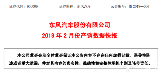 2019 年 3 月 4 日,东风汽车股份有限公司(以下简称“东风汽车”)发布2019 年 2 月份产销数据公告。