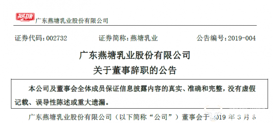 2019年3月5日,广东燕塘乳业股份有限公司(以下简称“燕塘乳业”)发布关于董事辞职的公告。