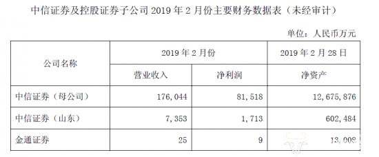 另外,中信证券子公司中信证券(山东)有限责任公司2019年2月营业收入为7353万元,净利润为1713万元;中信证券子公司金通证券有限责任公司2019年2月营业收入为25万元,净利润为9万元。