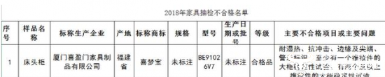 抽检结果显示,标称商标为“喜梦宝”的1批次床头柜被检出耐湿热、抗冲击、边缘及尖端、警示标识、至少有一个推拉件的大柜稳定性试验、有两个及以上推拉件的大柜稳定性试验项目不合格。
